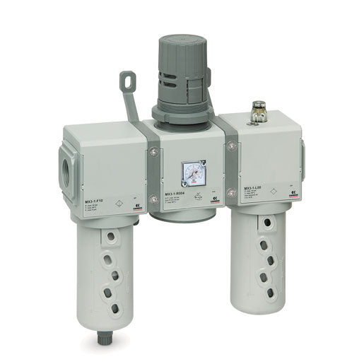 La serie MX permite la instalación de unidades de mantenimiento mediante soportes de montaje sencillos. El orden de montaje de los componentes se puede elegir libremente. La serie MX también está disponible completamente ensamblada con un código de pedido adecuado.