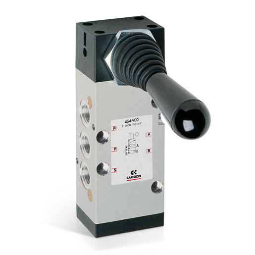 Funcionamiento 5/2 vías Las válvulas manuales Serie 3 (G1/8) y Serie 4 (G1/4), 3/2, 5/2 y 5/3 vías están disponibles con varios dispositivos diseñados para satisfacer